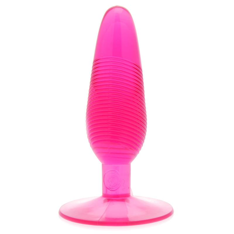 Anal plug with stimulation grooves in a sensitive pleasure design with narrow tip for easy penetration. Slippery jelly-like material. On a suction cup base. Material PVC.