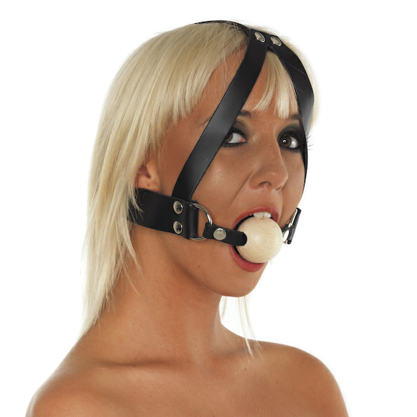 Genuine leather gag with wooden ball and head strap, adjustable with buckle.