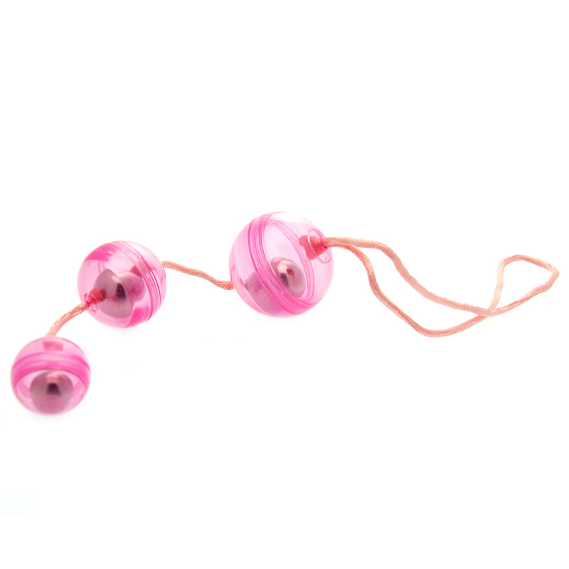 Pink are Small, Medium, and Large Weighted, Sturdy Translucent Pink Pleasure Balls with Nylon Cord.