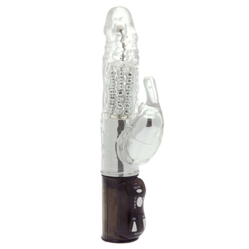 7x rabbit vibe with 5.5 insertable inch shaft. External bunny has 7 functions of vibration and pulsation. 1.7" thick shaft has 7 rows of beads that rotate at 6 different speeds. Tapered tip gyrates with the motion of the beads. Bunny and beads are controlled by separate motors. Phallic tip and raised veins on shaft. Phthalate free.